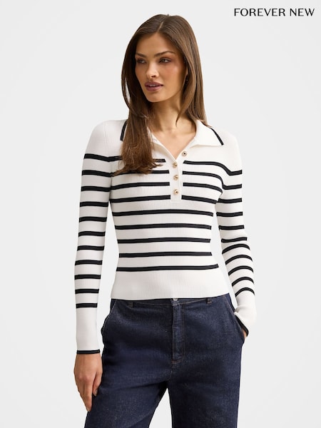 Forever New White Sasha Ribbed Knitted Polo T-Shirt