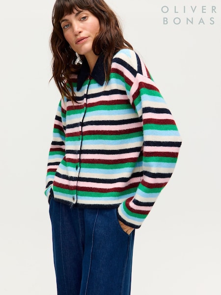 Oliver Bonas Blue Multicoloured Striped Collared Button Up Knitted Cardigan