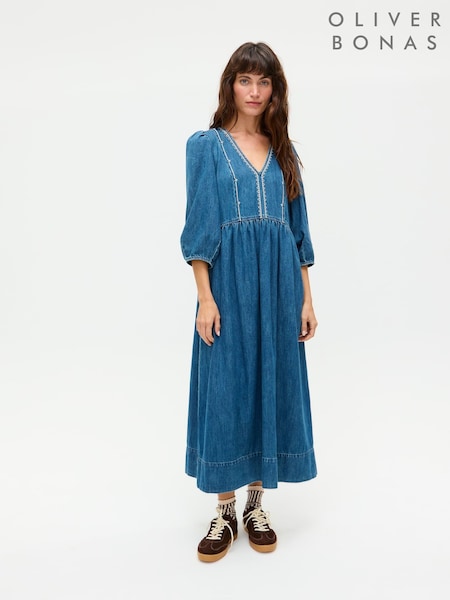 Oliver Bonas Blue Denim Embroidered V-Neck Midi Dress