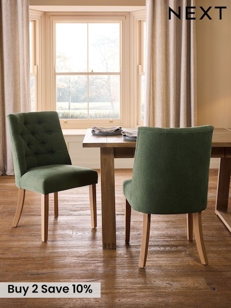 Set of 2 Soft Linen Look Green Malvern Button Light Wood Leg Dining Chairs