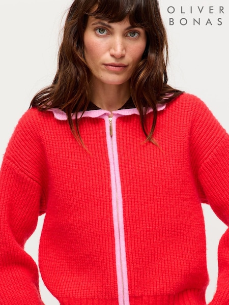 Oliver Bonas Red Red Scalloped Collar Zip Up Knitted Bomber Jacket