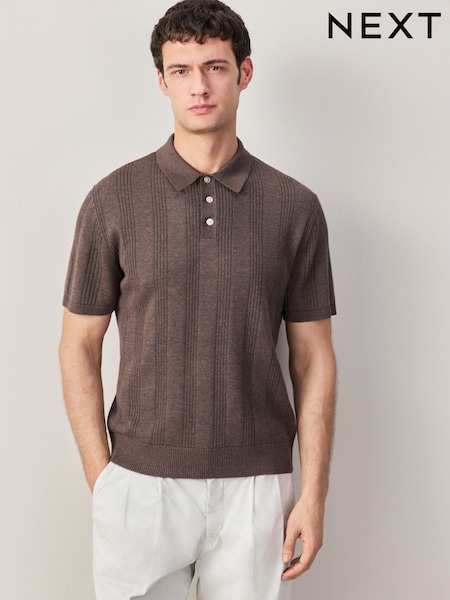 Truffle Brown Regular Fit Cotton Rich Pointelle Stripe Short Sleeve Knit Polo Shirt