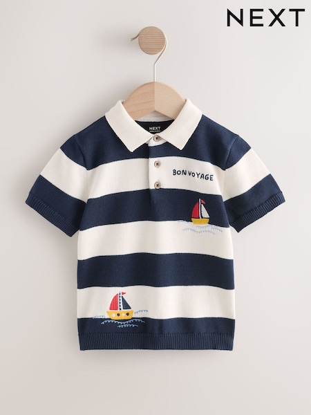 Navy Blue Boat Character Button Neck Knitted Polo Shirt (3mths-7yrs)
