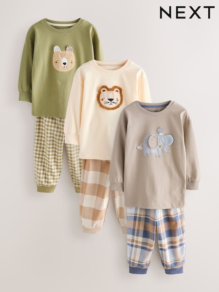 Olive Green/Stone/Ecru Animal Check Woven Bottom Pyjamas 3 Pack (9mths-8yrs)