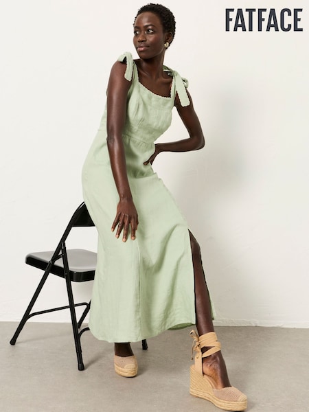 Ecru/Green Palm Print Ruched Bandeau Midi Dress with Linen