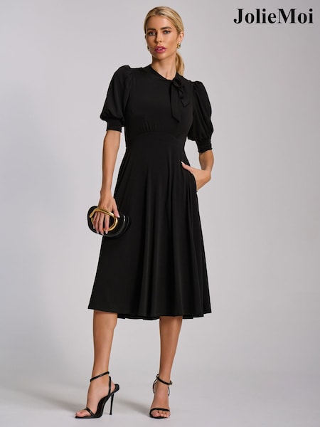 Jolie Moi Black Tie Neck Puffy Sleeve Jersey Midi Dress