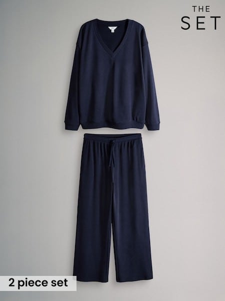 The Set Waffle V-Neck Sweat Top And Wide Leg Jogger Set Navy