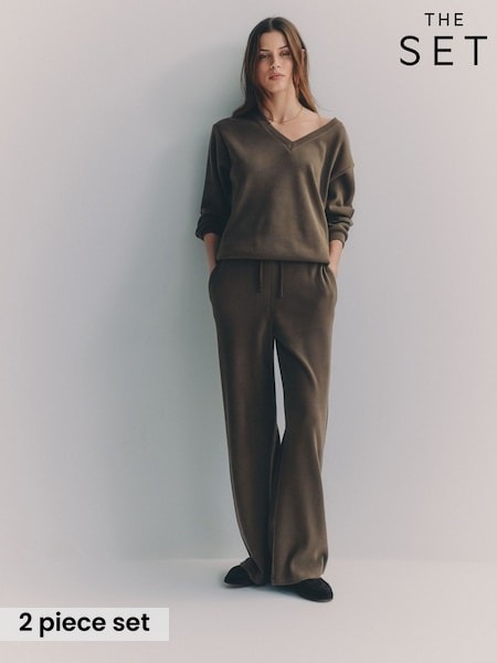The Set Waffle V-Neck Sweat Top And Wide Leg Jogger Set Taupe Brown