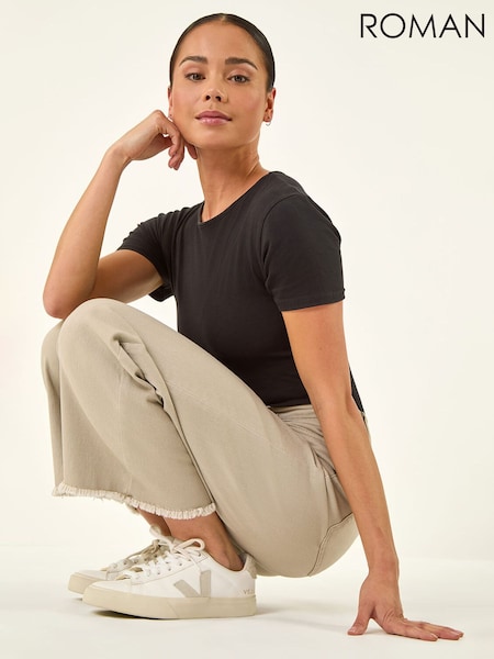 Roman Natural Petite Cotton Frayed Hem Trousers