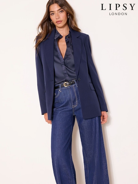 Reiss Navy Check Larissa Double-Breasted Check Blazer Cotton-Linen