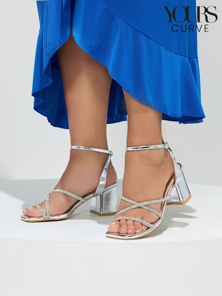 Yours Curve Silver Extra Wide Fit EEE Diamante Asymmetric Block Sandals