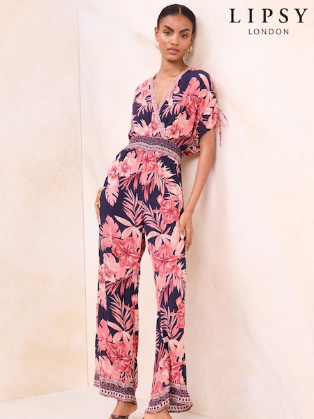 Lipsy Pink/Blue Petite Floral Kimono Sleeve Crinkle Jumpsuit