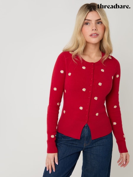 Threadbare Red Daisy Embroidered Crew Neck Knitted Cardigan