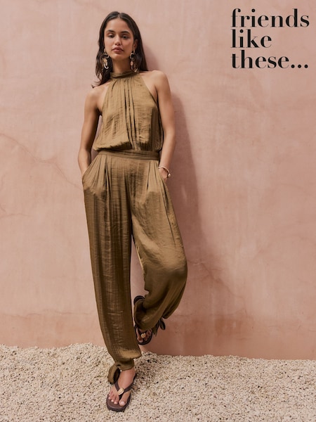 Friends Like These Olive Green Sleeveless Satin Halter Neck Jumpsuit