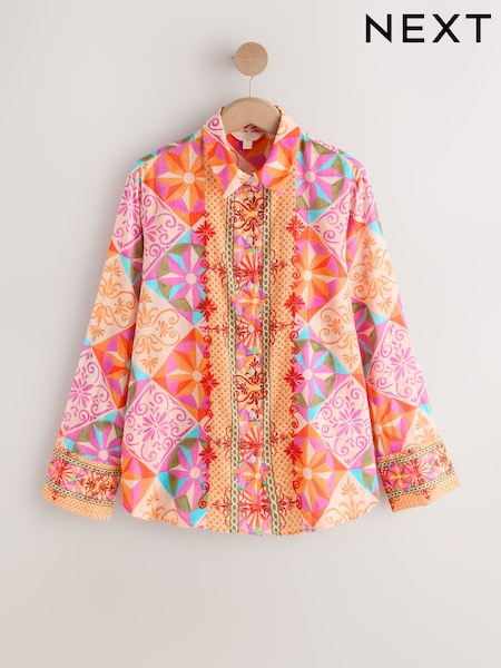 Pink/Orange Geometric Print Relaxed Long Sleeve Shirt With Linen